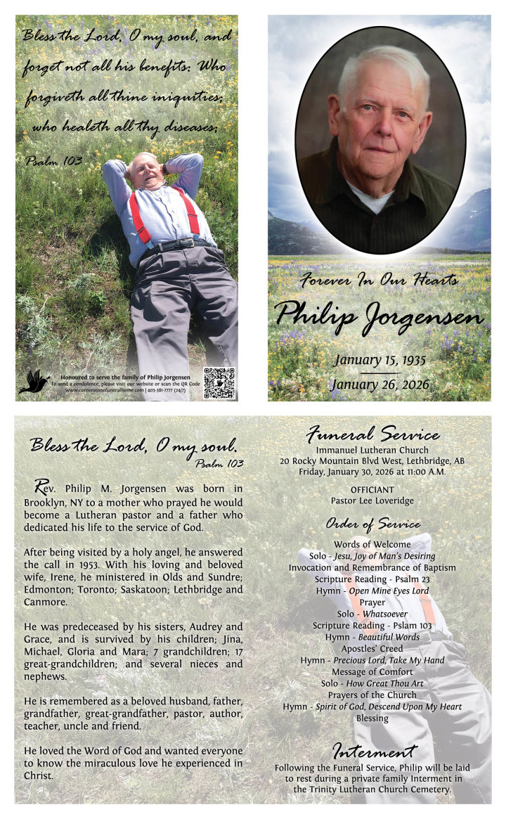 A Funeral Service will be held at IMMANUEL LUTHERAN CHURCH, 20 Rocky Mountain Blvd. West, Lethbridge, AB, on Friday, January 30, 2026 at 11:00 A.M. with Pastor Lee Loveridge officiating.