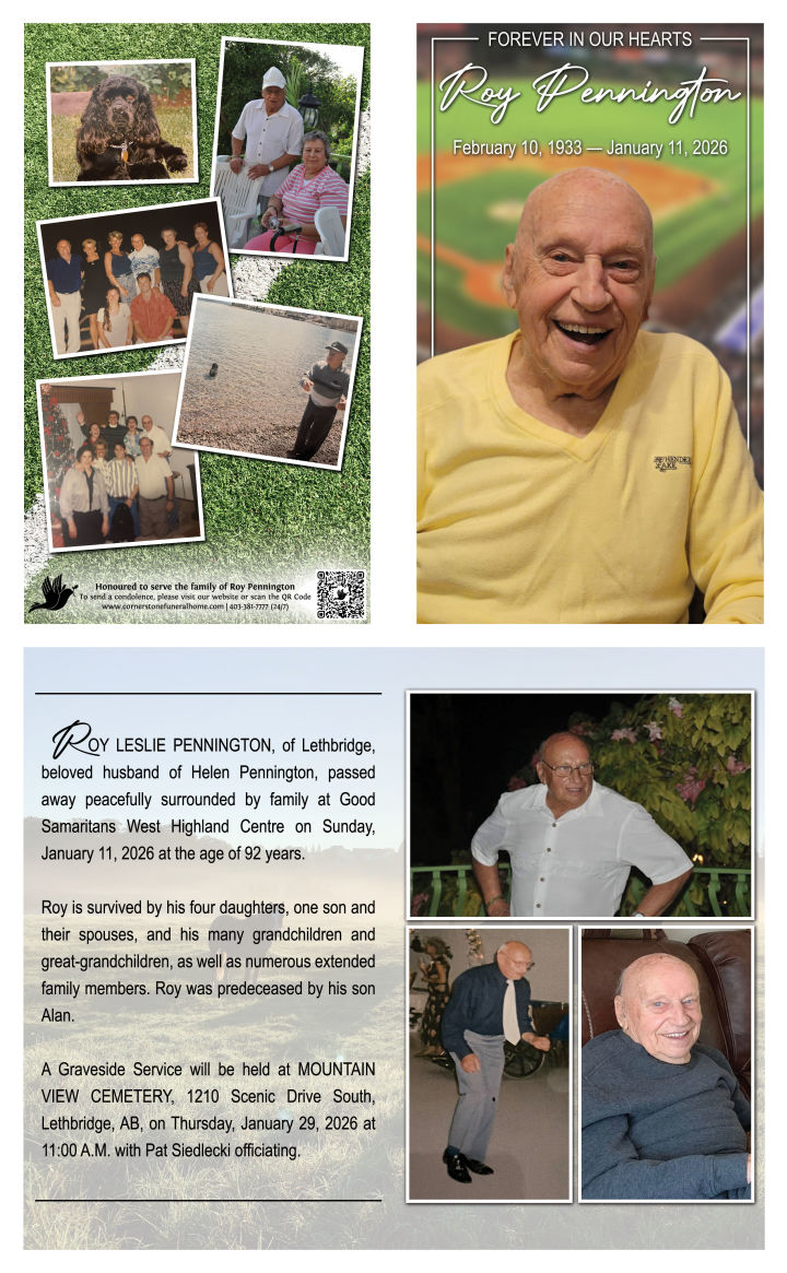 A Graveside Service will be held at MOUNTAIN VIEW CEMETERY, 1210 Scenic Drive South, Lethbridge, AB, on Thursday, January 29, 2026 at 11:00 A.M. with Pat Siedlecki officiating.